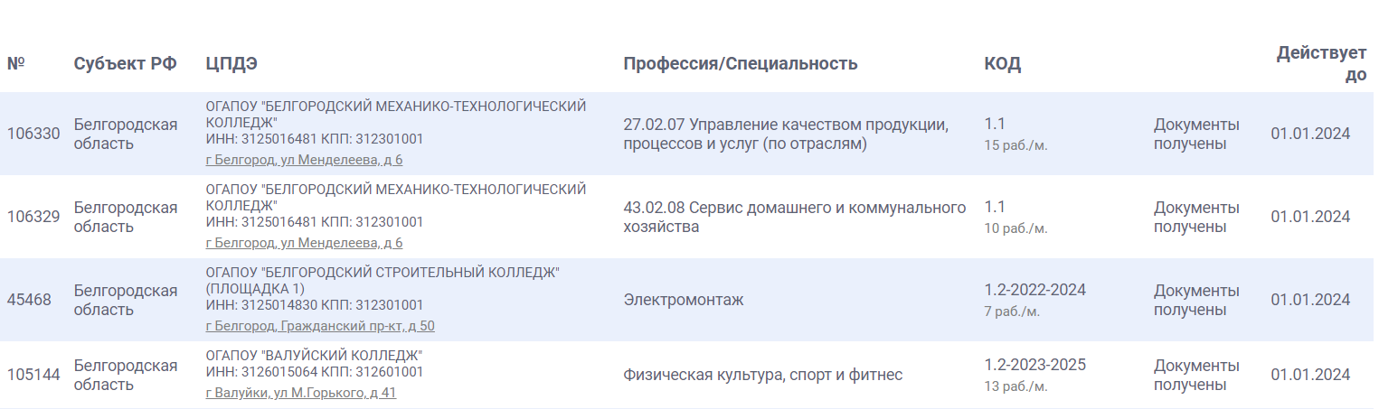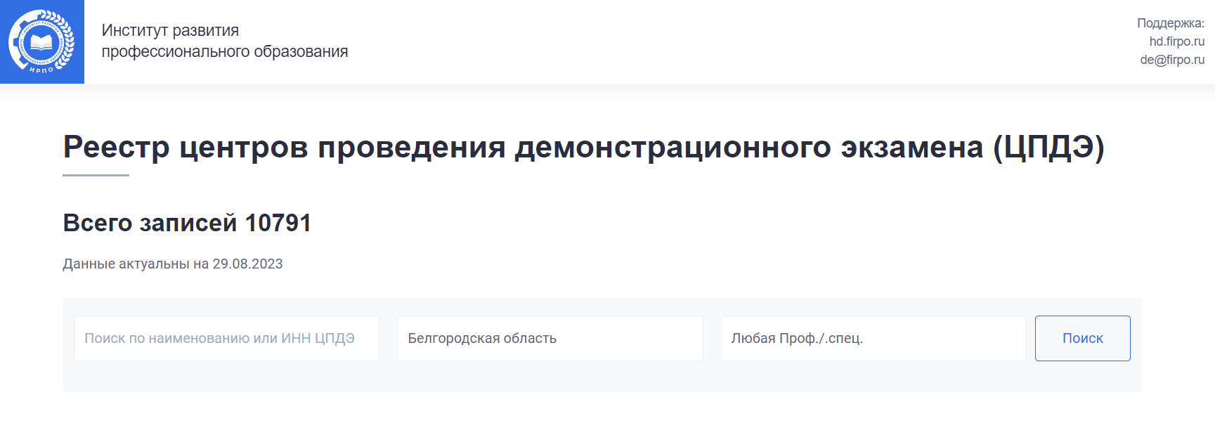 Реестр ЦПДЭ находится по ссылке: cpde.dp.firpo.ru Обновление Реестра ЦПДЭ происходит один раз в сутки, после рассмотрения сведений о ЦПДЭ, полученных в рамках процедуры регистрации в сервисе ЦПДЭ. Цель - формирование актуального перечня ЦПДЭ, соответствующих требованиям комплекта оценочной документации по конкретной профессии или специальности. ⇒Подробнее об организации ЦПДЭ и порядке обследования ЦПДЭ можно узнать по ссылке: de.firpo.ru/cpde