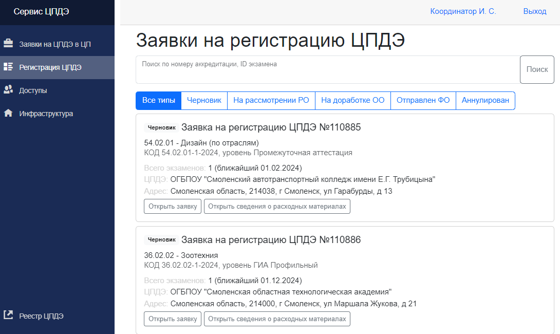 Сервис ЦПДЭ находится по ссылке: cpde.firpo.ru Сервис ЦПДЭ предназначен для формирования заявок на регистрацию ЦПДЭ и управления актуальными сведениями о ЦПДЭ в рамках процедуры обследования. Сервис ЦПДЭ объединил в себе информацию из ИСО (Цифровая платформа ДЭ, Банк оценочных материалов), ЕГРЮЛ и других справочников.