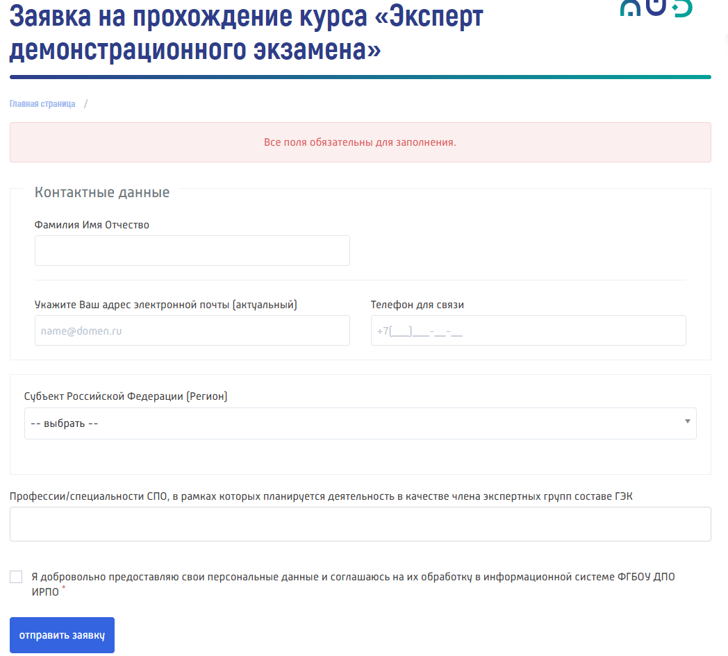 Шаг 1. Заполнение заявителем регистрационной формы по ссылке https://de.firpo.ru/sdo_reg/ с указанием: - Фамилии, имени и отчества; - Электронной почты; - Контактного номера телефона; - Региона; - Профессий/специальностей СПО, в рамках которых планируется деятельность в качестве члена экспертных групп в составе государственной экзаменационной комиссии.
