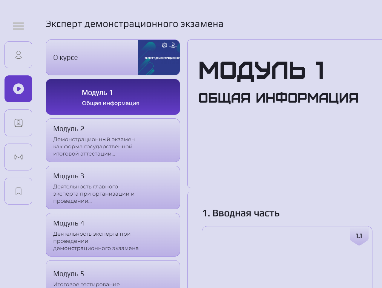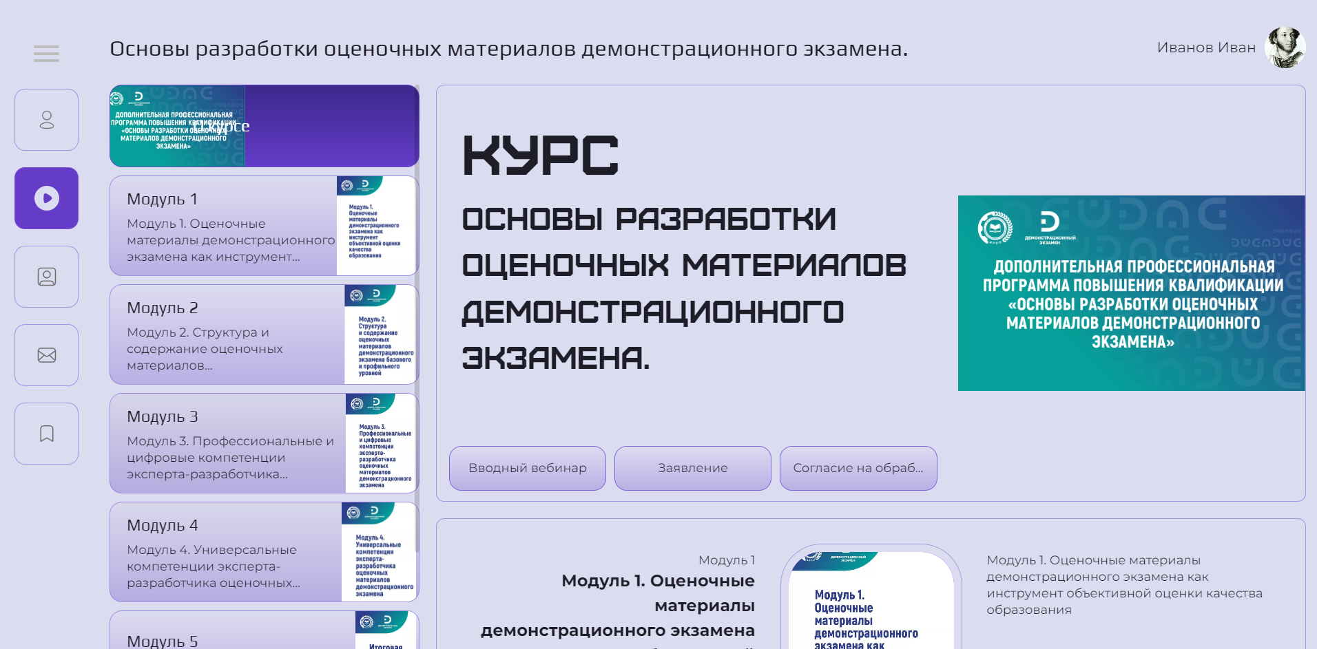 В настоящее время в системе дистанционного обучения доступны два курса: Специальная программа обучения «Эксперт демонстрационного экзамена» Дополнительная профессиональная программа повышения квалификация «Основы разработки оценочных материалов демонстрационного экзамена». Освоение программы обучения «Эксперт демонстрационного экзамена» в системе дистанционного обучения осуществляется по следующему алгоритму: