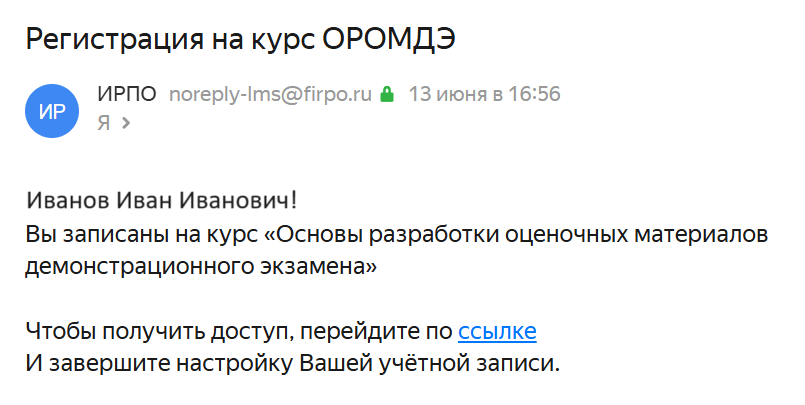 Напоминаем, завершение курса считается успешным при получении 80 и более баллов по результатам итогового тестирования. Шаг 4. Присвоение слушателю статуса «Эксперт демонстрационного экзамена». Внесение данных в реестр экспертов демонстрационного экзамена. Обратите внимание, подтверждением полномочий эксперта является внесение в реестр, выдача документов не предусмотрена. Дополнительная профессиональная программа повышения квалификации «Основы разработки оценочных материалов демонстрационного экзамена» Регистрация в системе дистанционного обучения и зачисление на курс осуществляется федеральным оператором посредством направления на электронную почту, указанную при подаче заявки на участие в разработке оценочных материалов, сообщения о регистрации в системе и зачислении на курс. Пример такого письма:
