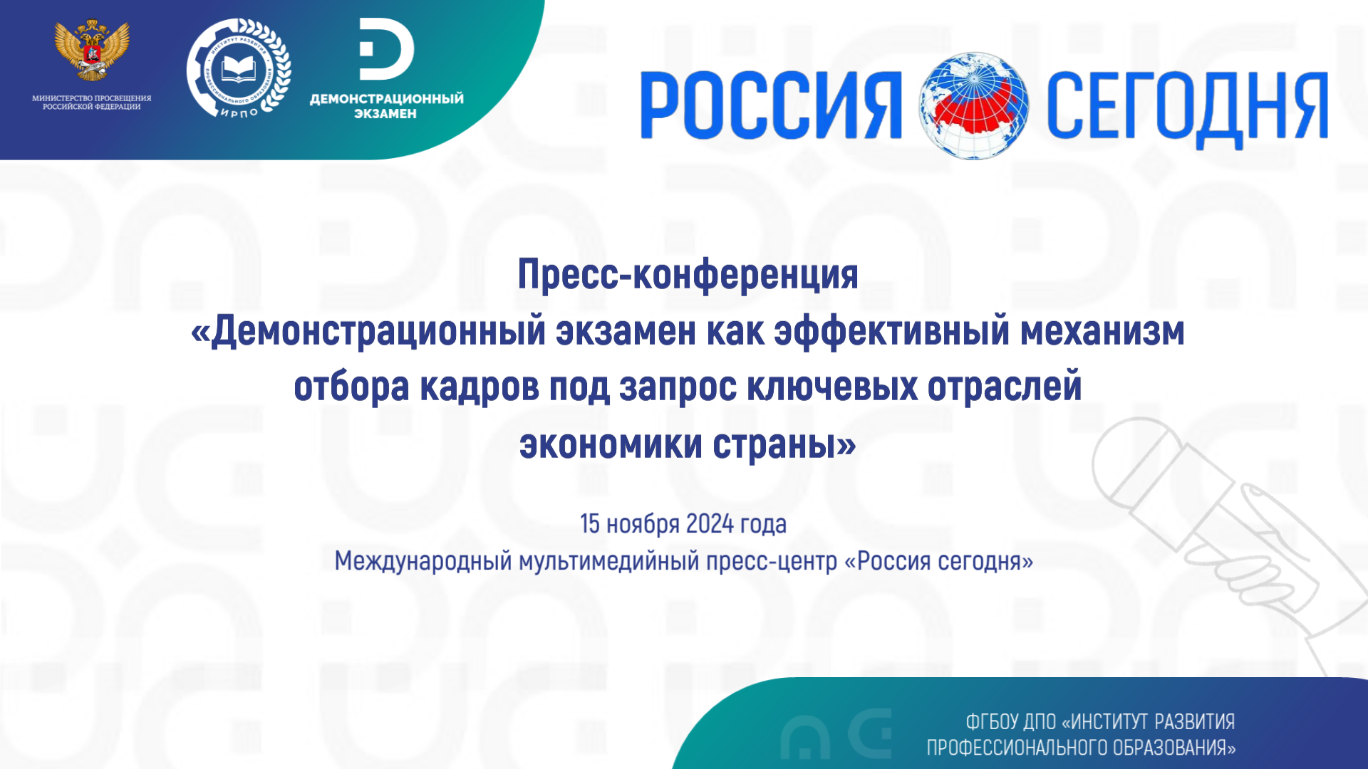 На пресс-конференции обсудят итоги демонстрационного экзамена за 2024 год, эффективность внедрения такой формы аттестации, инструменты для успешного трудоустройства выпускников, алгоритмы взаимодействия образовательных организаций и работодателей, а также представят успешные кейсы совместной работы.