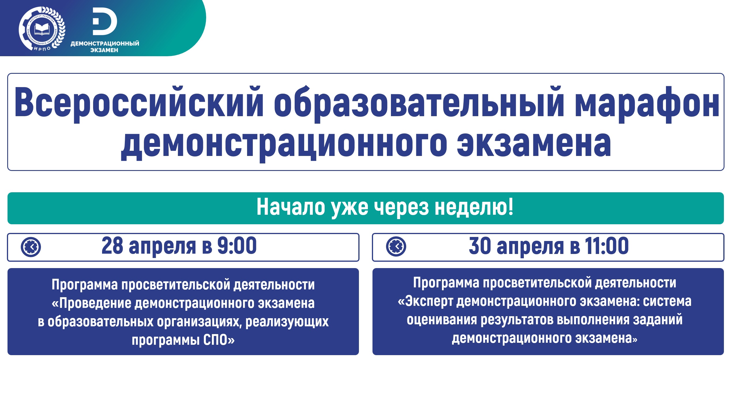 Уважаемые коллеги! Рады сообщить, что в следующий понедельник, 28 апреля 2025 года, начнутся мероприятия Всероссийского образовательного марафона демонстрационного экзамена.